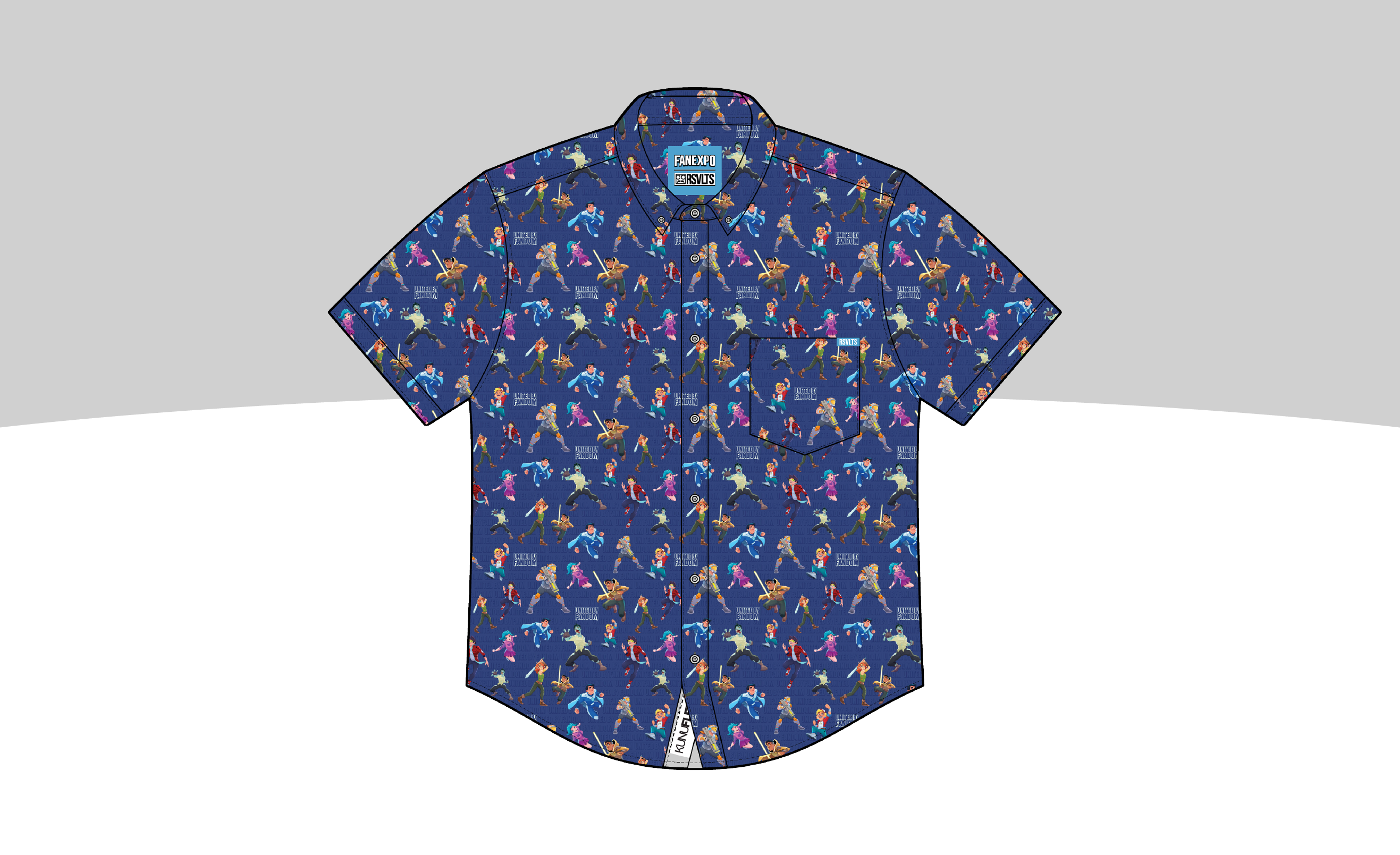A dark blue short-sleeve button-up with characters that represent each genre of fandom, along with the tagline, "United by fandom" displayed all over.